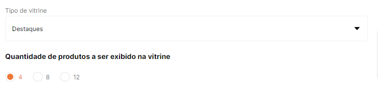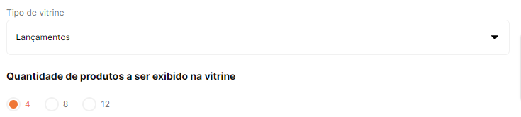Escolha entre Lançamentos, Destaques, Produtos em promoção e produtos com frete grátis a ser exibido na capa de sua loja virtual junto com a quantidade de 4 a 12 posições.