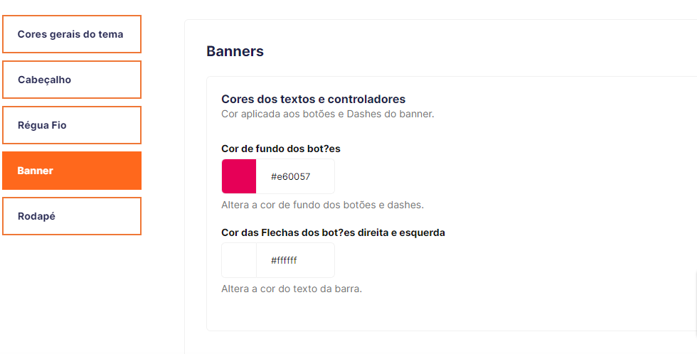 Em banner, disponibilizamos a opção para alterar as cores das setas e dashes(bolinhas) assim, você poderá alterar quando quiser ou quando precisar para seguir a identidade dos banners adicionados na loja.