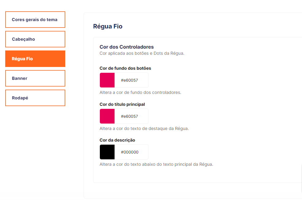 Em régua fio, você poderá alterar as cores dos textos do local, pare seguir o designer de sua loja